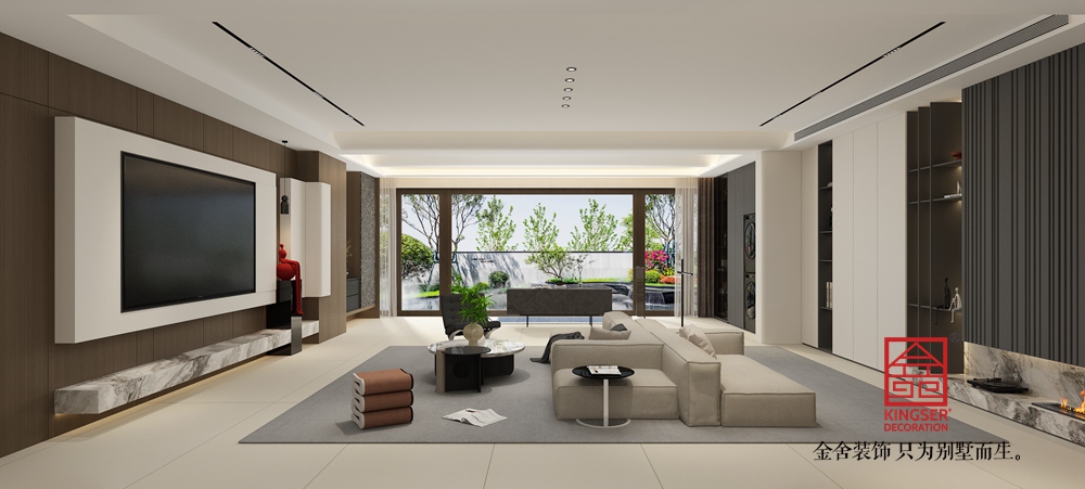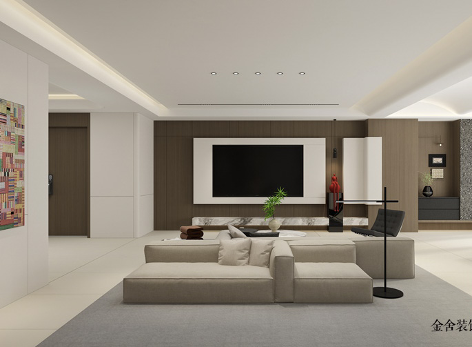 該客廳設(shè)計(jì)以現(xiàn)代簡約為基調(diào),巧妙融合質(zhì)感與美學(xué)。空間以柔和的米白、淺棕為主色調(diào),搭配灰色地毯,營造出靜謐優(yōu)雅的氛圍。
