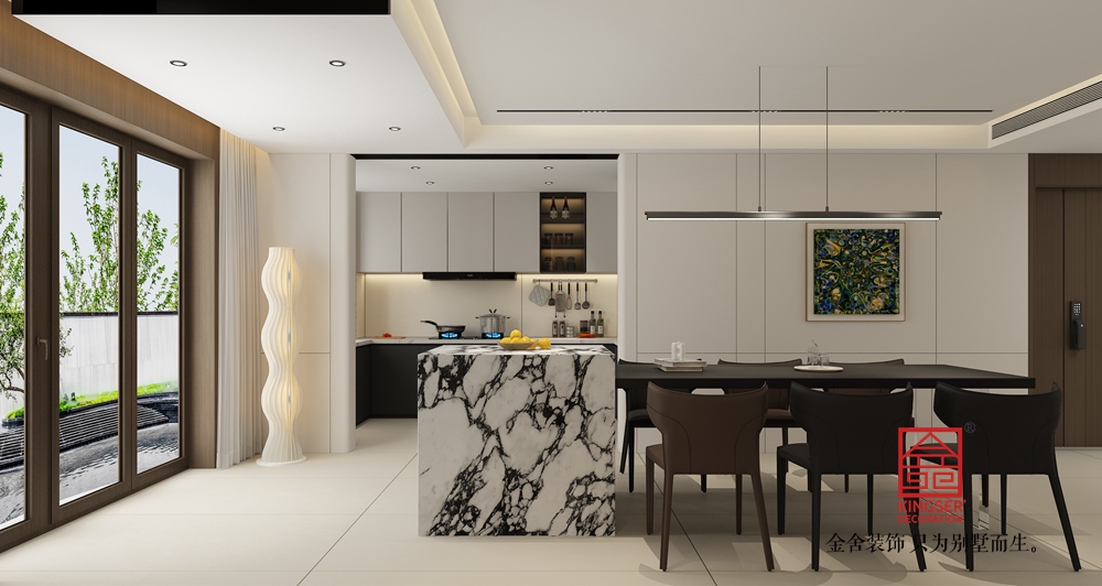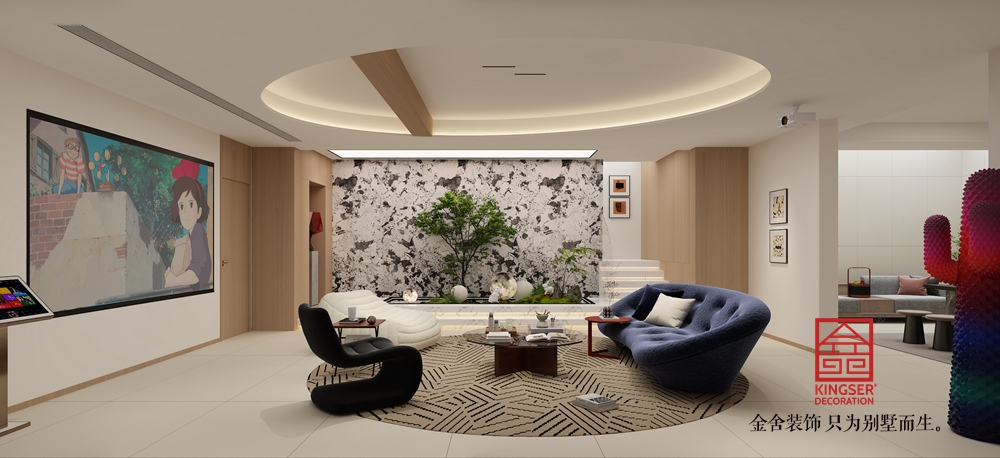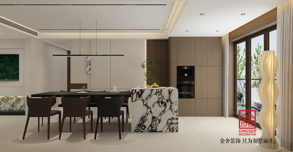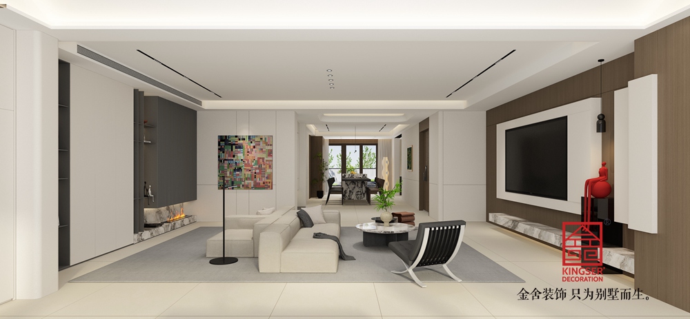 裝飾上,左側(cè)色彩絢麗的藝術(shù)畫作,為空間注入藝術(shù)活力;綠植與特色擺件的點(diǎn)綴,讓空間更顯生機(jī)與個(gè)性。充足的自然采光透過大窗涌入,結(jié)合精心設(shè)計(jì)的室內(nèi)照明,使空間明亮通透。整體設(shè)計(jì)簡約卻不失格調(diào),每一處細(xì)節(jié)都彰顯出對高品質(zhì)別墅生活的用心營造。