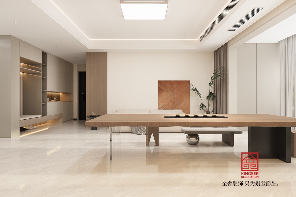 材質上,原木的自然質感、大理石的光潔以及金屬的精致相互融合,層次豐富。燈光設計巧妙,嵌入式燈帶與頂燈營造出柔和均勻的光照,凸顯空間通透感。整體設計摒棄傳統客廳的刻板,以實用與美學兼具的布局,為居者帶來更具個性與深度的生活體驗,詮釋了去客廳化設計對生活方式的創新與升級。