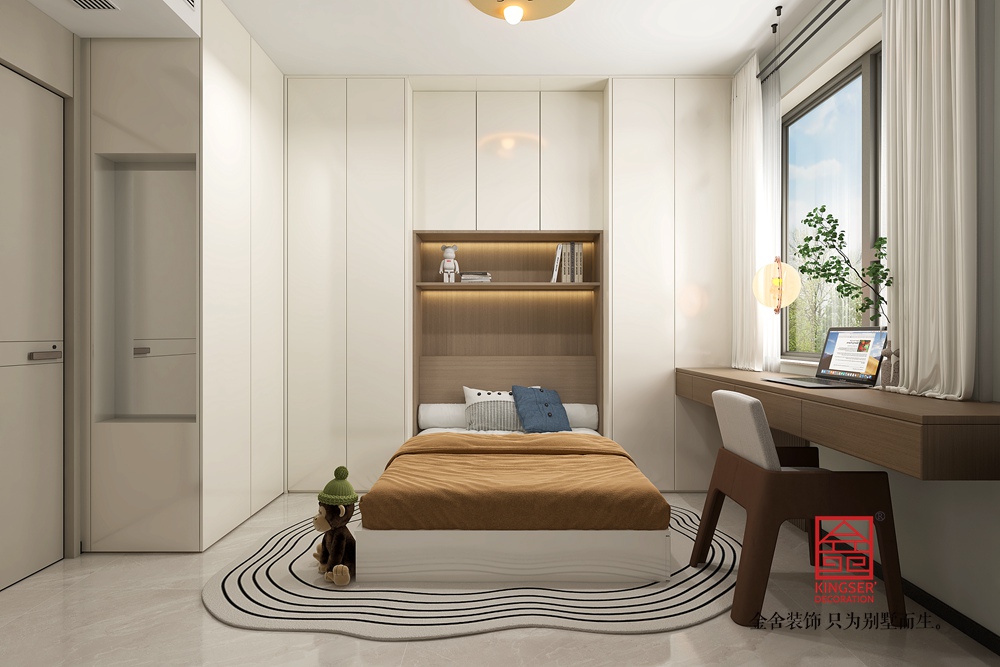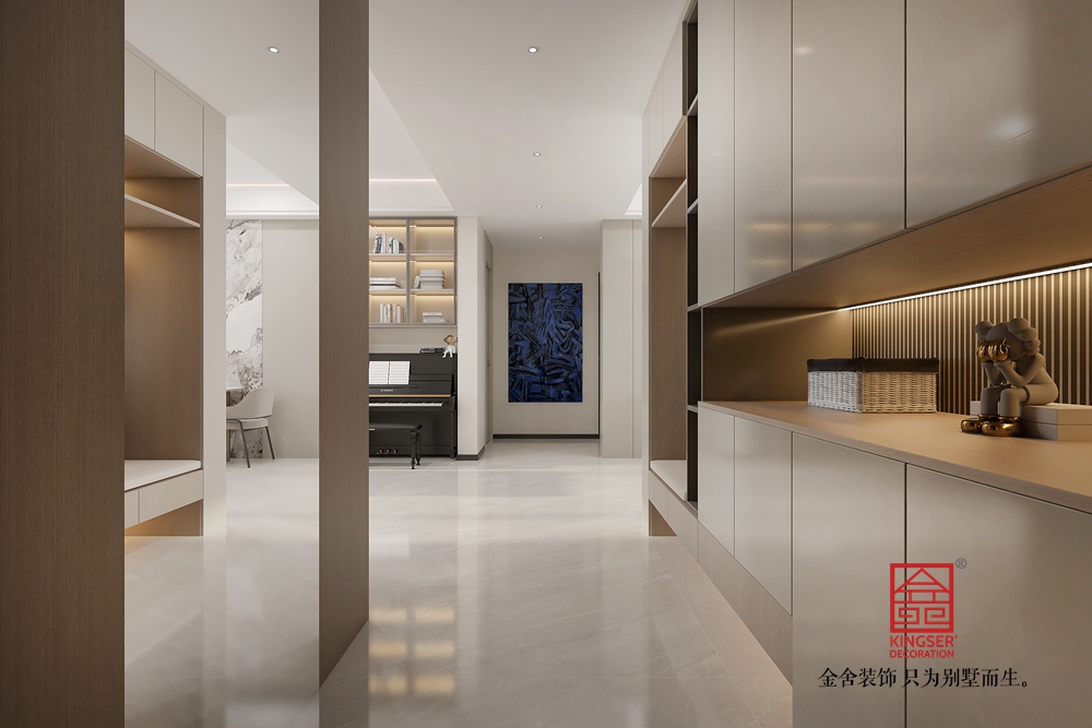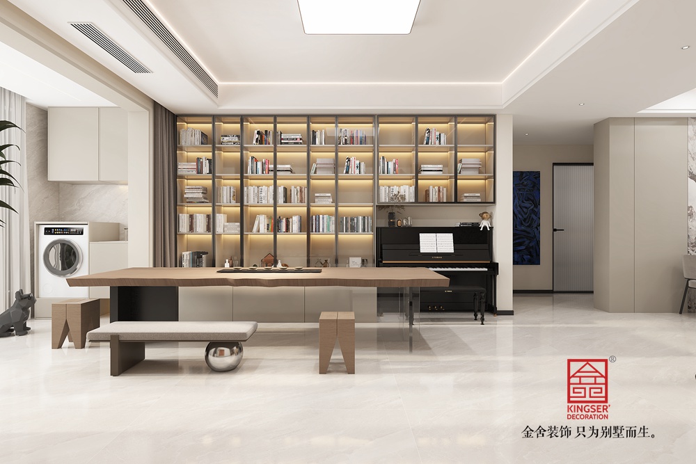 此空間采用去客廳化設計,打破傳統客廳單一社交功能的局限,打造出集閱讀、藝術、休閑等多元體驗于一體的復合區域。 整面玻璃書柜兼具收納與展示功能,暖光加持下,書籍仿若藝術品,營造出靜謐的閱讀氛圍。原木長桌造型獨特,成為空間核心,可滿足閱讀、手工等多樣需求,搭配簡約座椅與長凳,為互動交流提供靈活場景。鋼琴的融入,為空間注入藝術氣息,讓居者能隨時沉浸于音樂世界。