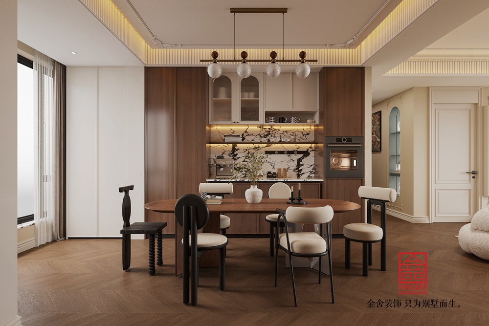 頂部獨(dú)特的串珠吊燈,造型別致,燈光透過珠串散發(fā)柔和光暈,為空間蒙上一層復(fù)古浪漫的濾鏡。背景墻的柜體設(shè)計(jì),兼具收納與展示功能,陳列的物品為空間增添了故事感與文化底蘊(yùn),整體打造出一個(gè)復(fù)古雅致且舒適宜人的中古風(fēng)客廳空間。